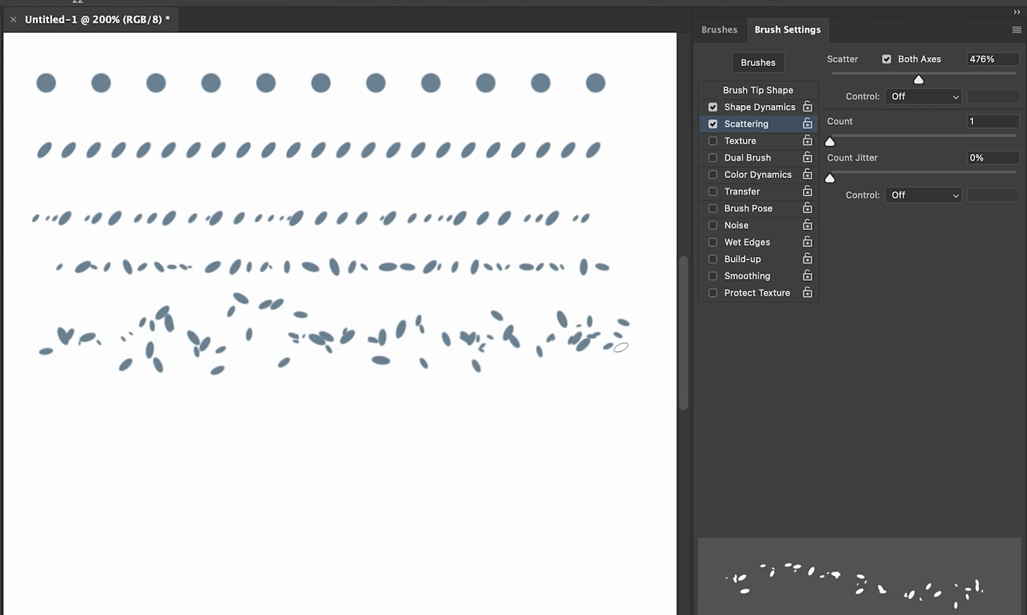 • 산란 효과(Scatter) 를 켜면 브러시가 퍼지는 듯한 효과