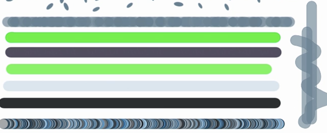 이제 웻 미디어 브러시(wet media brushes) 를 보겠습니다. 예를 들어, Wet Blender브러시에서 스머지 도구(Smudge Tool) 로 바뀝니다. 그래서 하얀 배경을 칠할 때는 아무 일도 없는 것처럼 보이지만, 파란색 부분을 칠하면 색이 섞입니다.