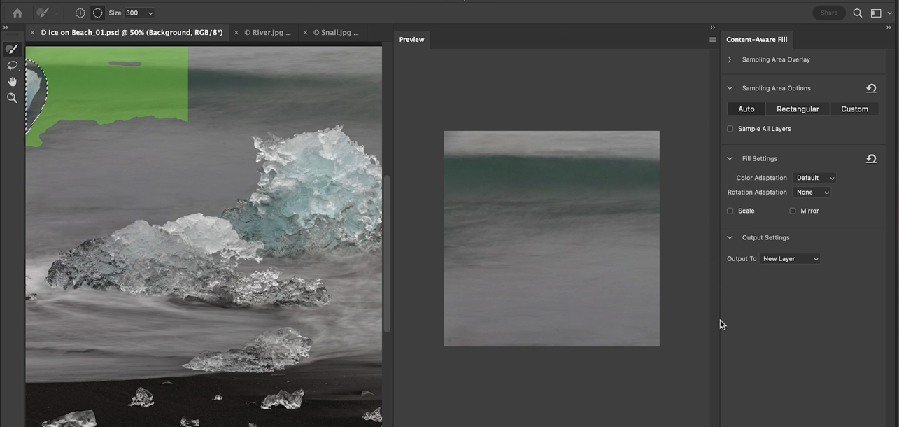 다음으로 오른쪽의 얼음을 제거합니다. 얼음 주위의 물결 무늬 때문에 Photoshop이 헷갈릴 수 있으므로, 좀 더 여유 있게 선택하는 것이 좋습니다. 다시 한 번 Apply를 눌러 적용합니다.