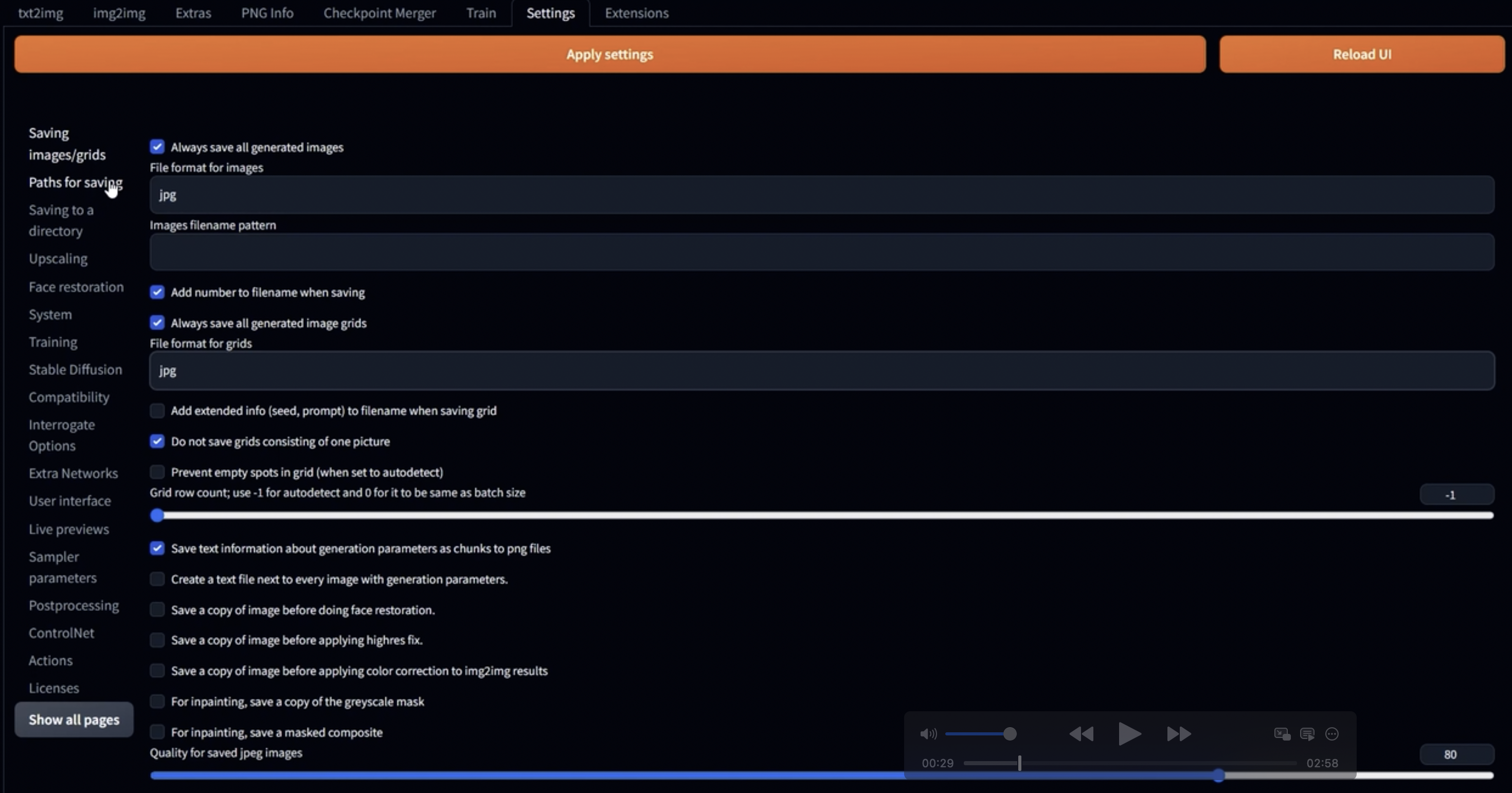 Settings 탭의 savings/images/grids 항목에서, 이미지의 파일 형식을 JPEG으로 설정하는 것이 좋습니다. 기본값은 PNG로 되어 있는데, PNG는 파일 크기가 더 크기 때문에 컴퓨터의 메모리 용량이 걱정된다면 JPEG이 더 적합합니다.