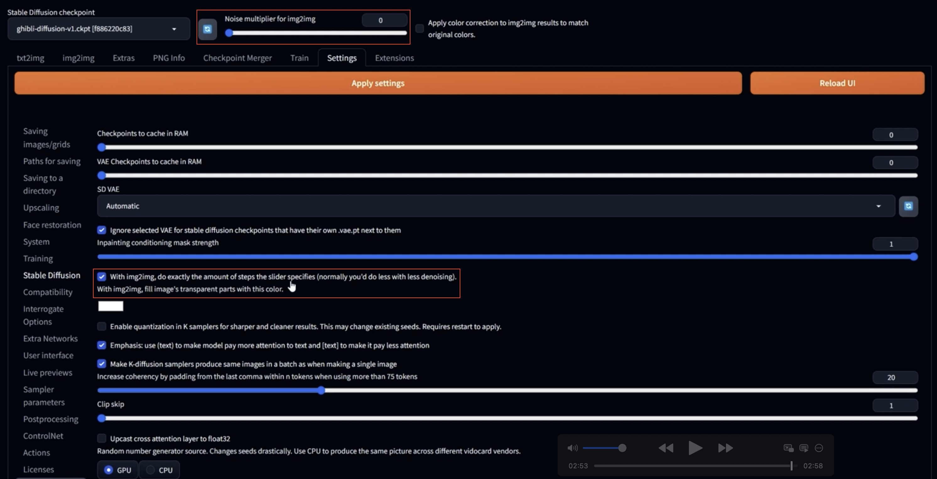 모든 설정을 마쳤다면, **“Apply Settings”**를 클릭하고 UI를 재시작(Reload UI) 해주세요. 그러면 새로운 슬라이더인 Noise Multiplier가 생긴 것을 볼 수 있습니다.