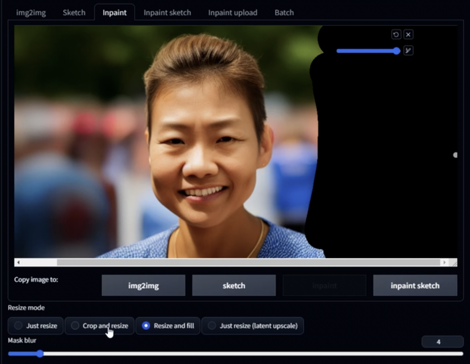 • 다시 그 영역을 브러시로 선택하고 Inpainting을 재적용해 보세요.