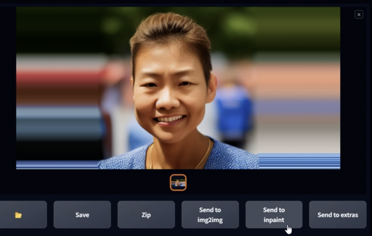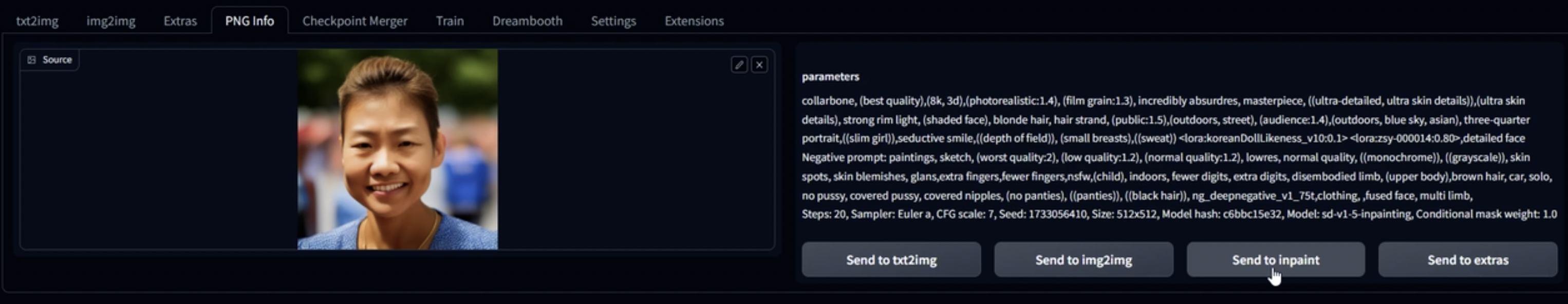 “Send to Inpaint”를 눌러 Inpaint 모드로 보냅니다.