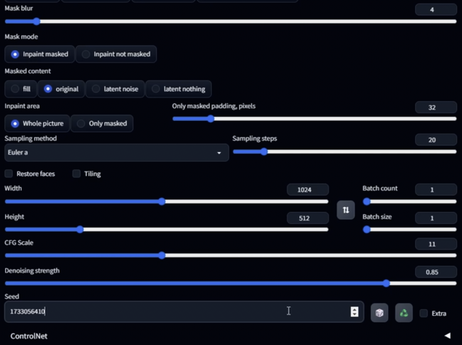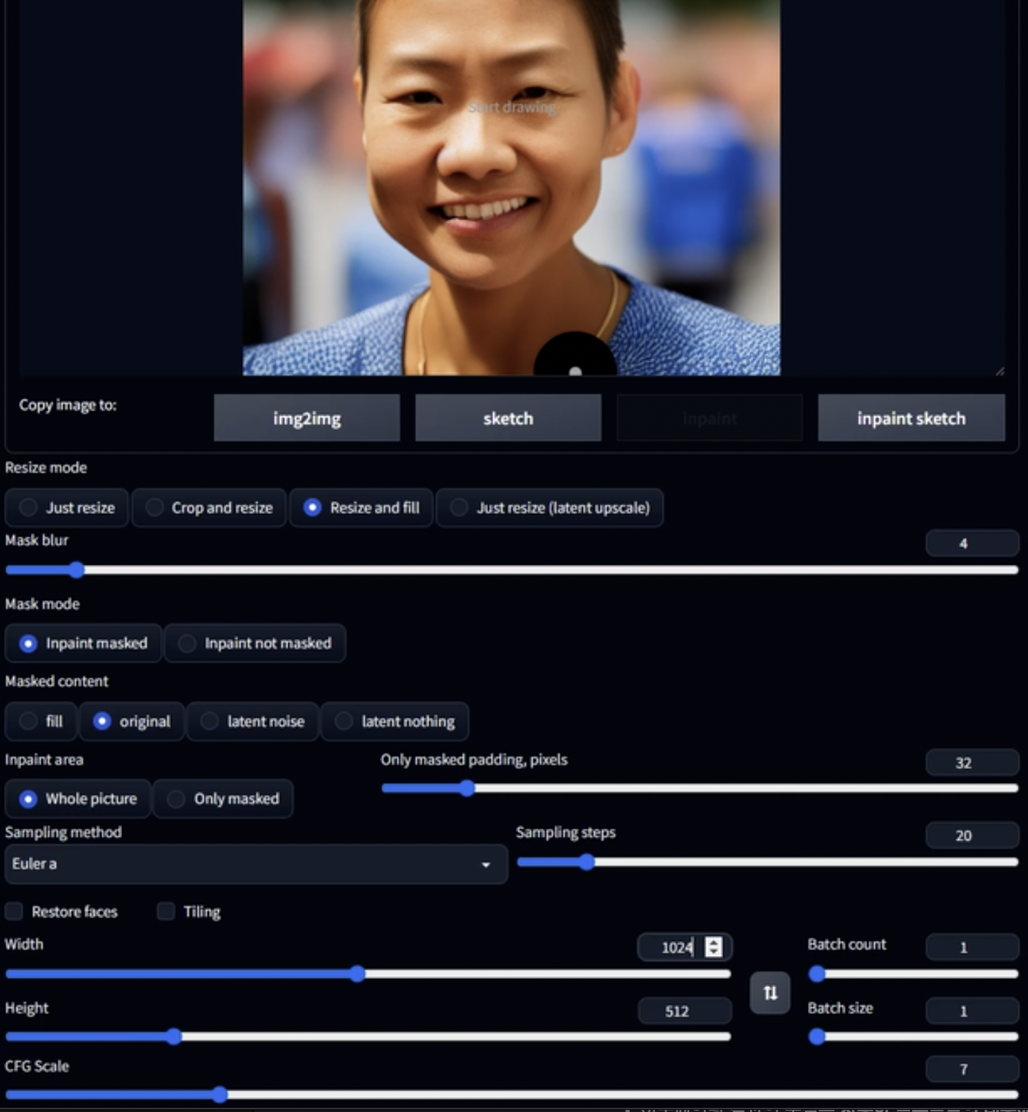 3. 프롬프트와 마스크 타입(inpaint masked)을 확인하고