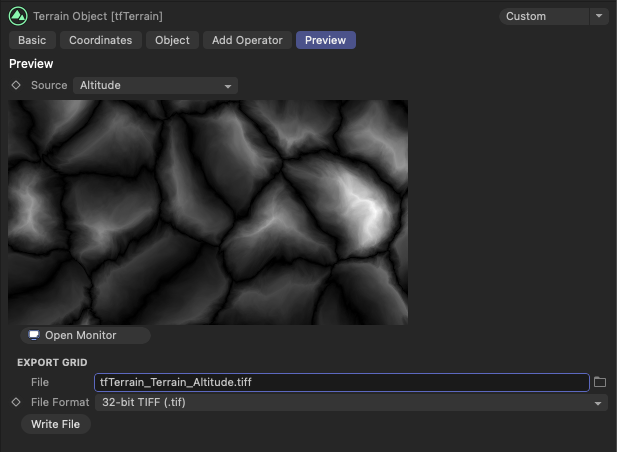 tfTerrain을 선택하고 Preview에서 Map을 추출할 수 있습니다. 기본 프로젝트가 저장된 폴더에 Map이 추출이 됩니다. 이 Map을 활용해서 Displace Map으로 활용해서 사용할 수 있습니다.
