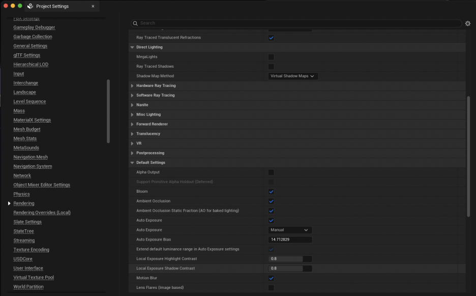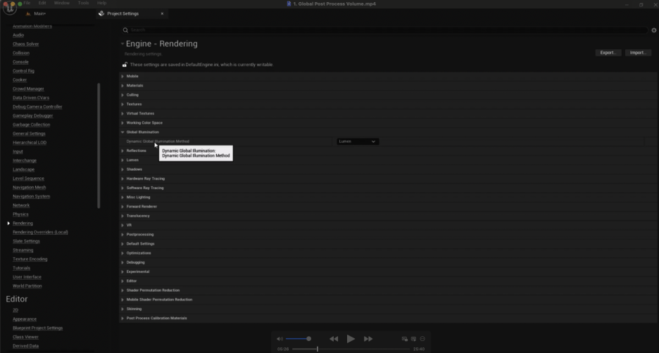 - **프로젝트 세팅(Project Settings)**의 렌더링(Rendering) 탭으로 이동하여 **글로벌 일루미네이션(Global Illumination)**과 **리플렉션 캡처 메서드(Reflection Capture Method)**를 **루멘(Lumen)**으로 설정합니다. 루멘은 간접 조명과 반사를 실시간으로 계산하는 언리얼 엔진 5의 강력한 시스템입니다.