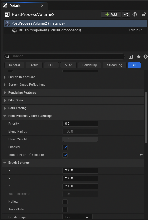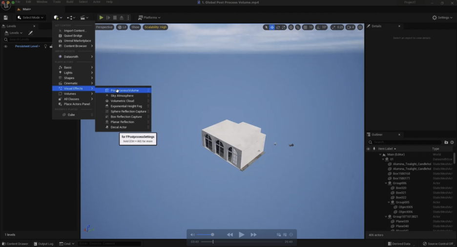 - 아웃라이너(Outliner) 또는 플레이스 액터(Place Actors) 패널에서 포스트 프로세스 볼륨을 찾아 씬에 추가할 수 있습니다.