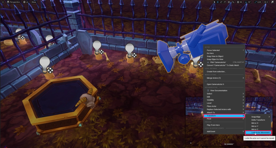 - 카메라 잠금: 조정된 카메라 액터를 다시 선택하고 Transform > Lock Actor Movement를 클릭하여 잠금 상태로 되돌려 실수로 위치가 변경되는 것을 방지합니다.