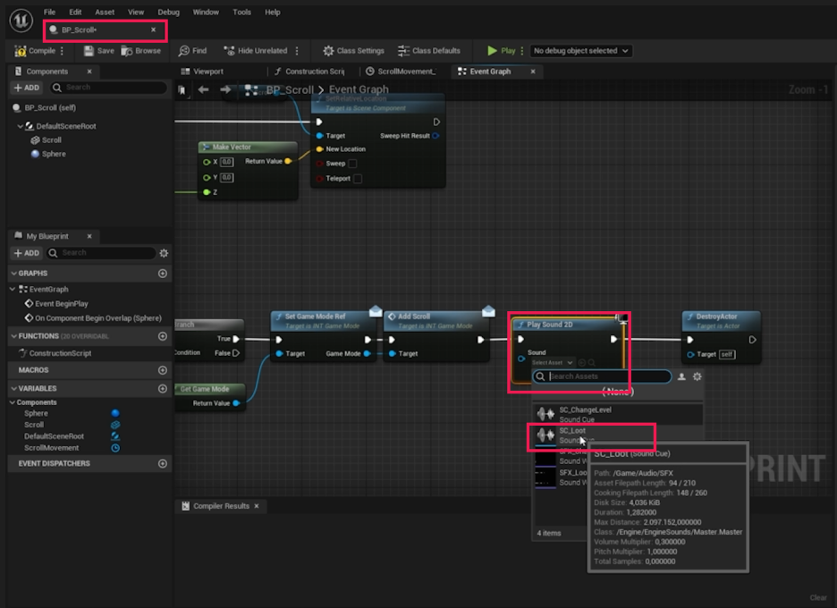 - Play Sound 2D의 Sound 슬롯에 **SC_Loot**를 선택합니다. (액터가 파괴되기 직전에 사운드가 재생됩니다.)
