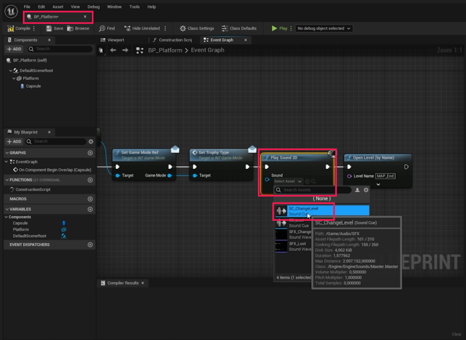 - **BP_Platform**의 Open Level 로직에서 Play Sound 2D 노드는 삭제합니다.