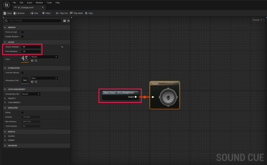 - sfx_change_level 파일을 마우스 오른쪽 버튼으로 클릭하고 Create Cue를 선택합니다. 이름을 **SC_ChangeLevel**로 지정합니다.