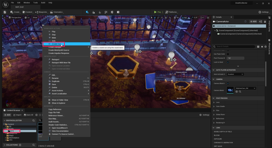 - sfx_loot 파일을 마우스 오른쪽 버튼으로 클릭하고 Create Cue를 선택합니다. 이름을 **SC_Loot**으로 지정합니다.