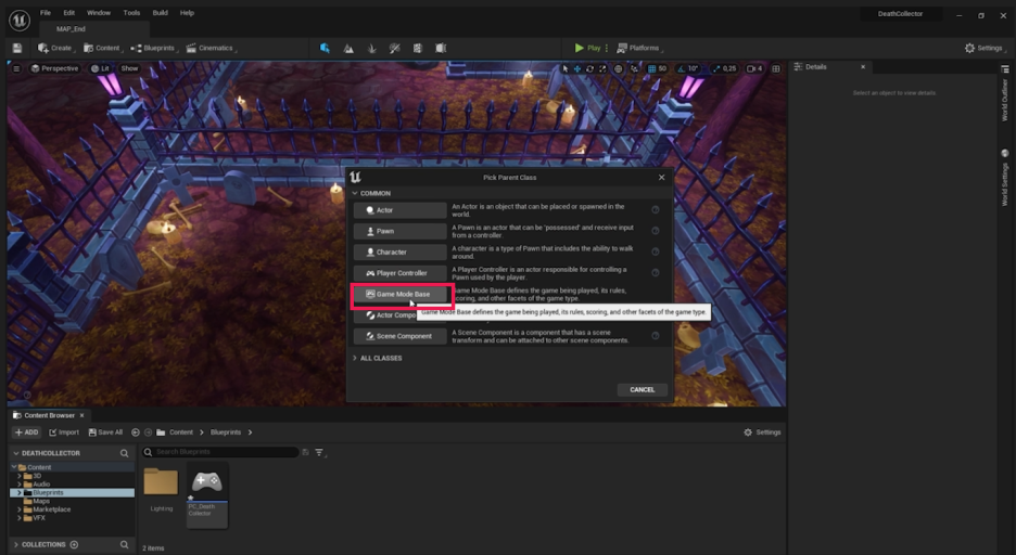 - 이번에는 Game Mode Base를 선택하고 이름을 GM_DeathCollector라고 지정합니다.