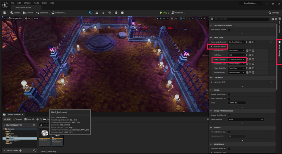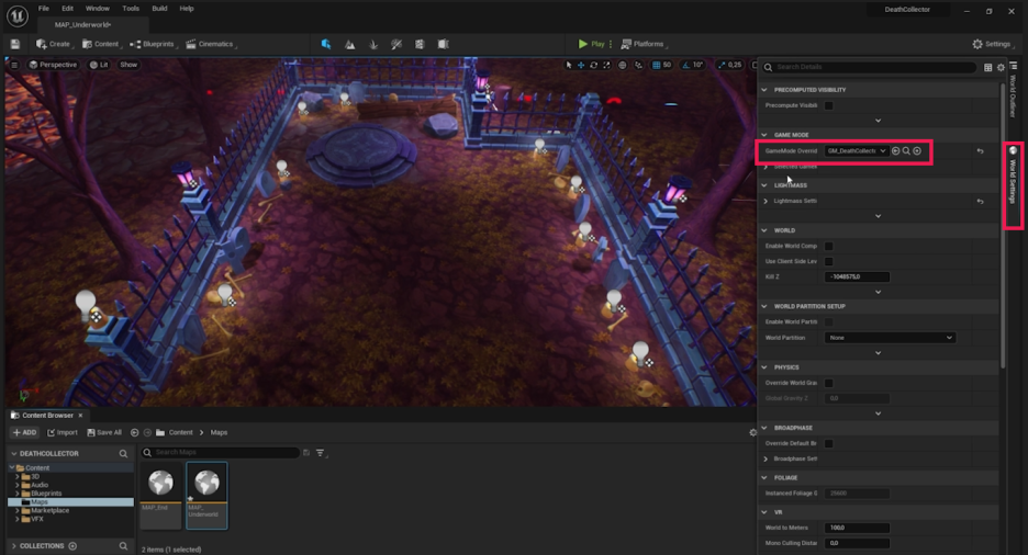 - 현재 맵인 Underworld 맵을 클릭한 상태에서, World Settings에서 **GameMode Override (게임 모드 오버라이드)**를 GM_DeathCollector로 변경합니다.