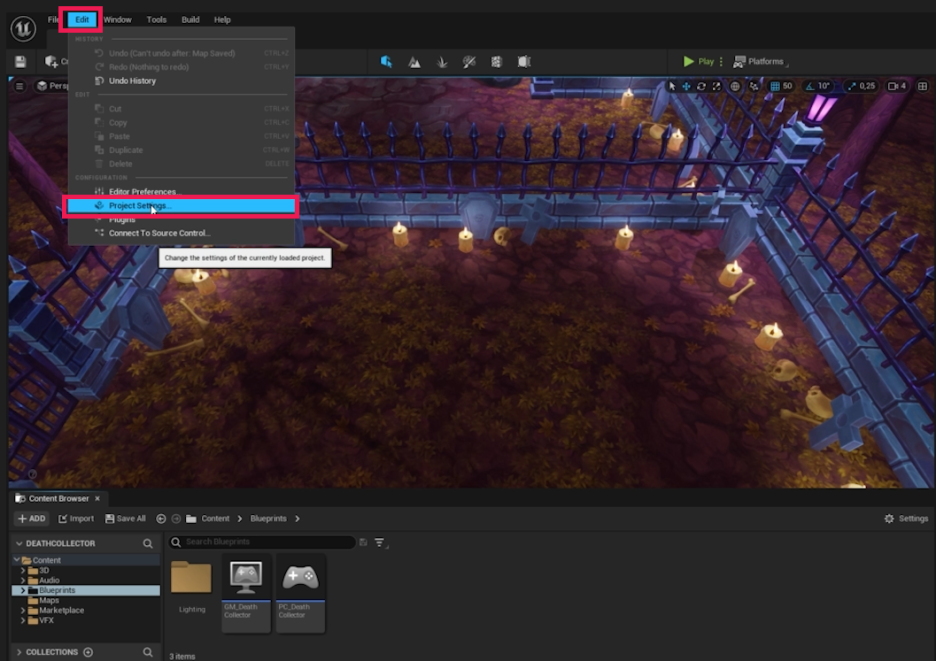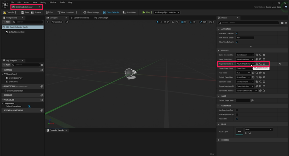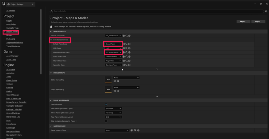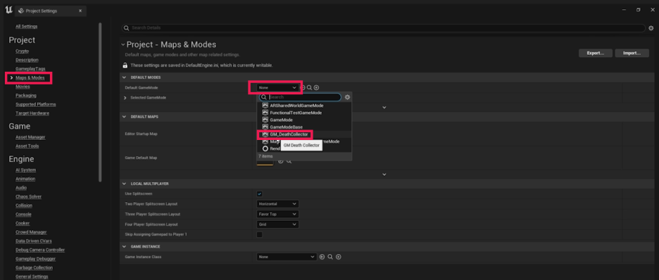 - 여기에서 Default GameMode를 방금 만든 사용자 지정 게임 모드인 GM_DeathCollector로 변경해야 합니다.