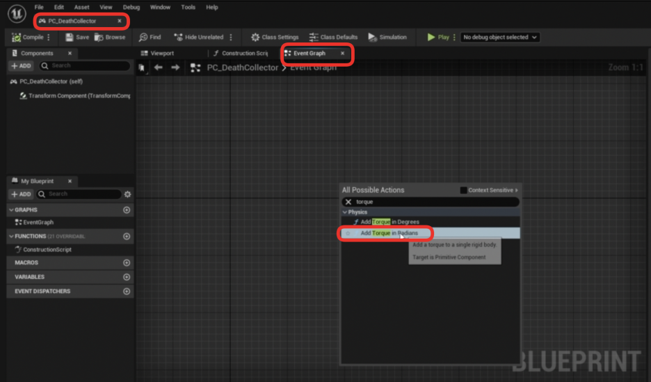 - 우리는 Add Torque in Radians 노드를 사용할 것입니다. (일반 캐릭터 움직임에는 사용되지 않고, 공처럼 굴러다니는 물체에 적합합니다.)
