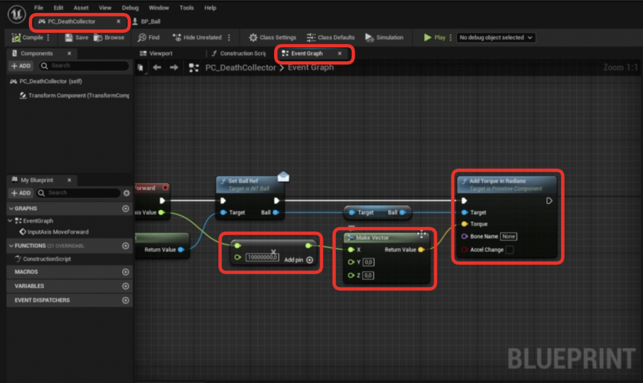- Make Vector의 출력을 Add Torque in Radians 노드의 Torque 핀에 연결합니다.
