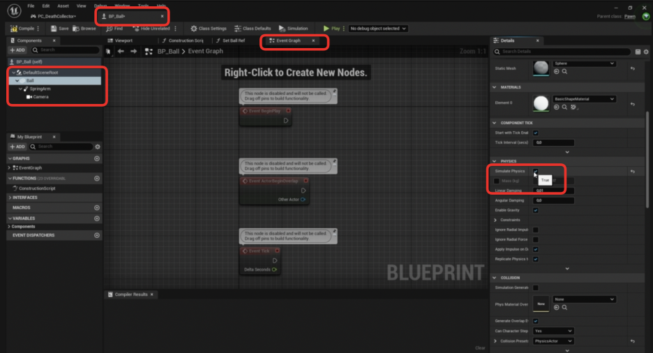 - BPBall 블루프린트에서 **ball (Sphere Component)**을 선택합니다.