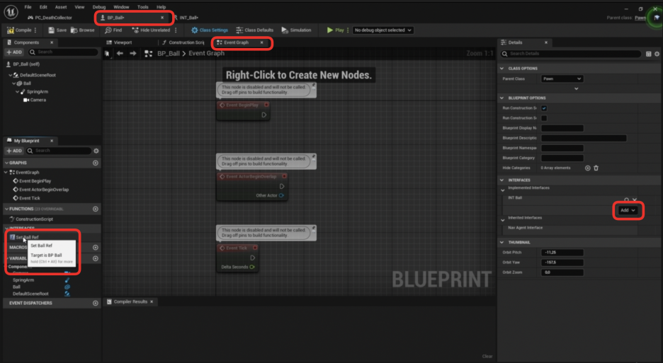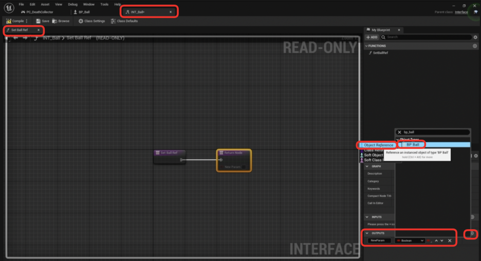 3. 블루프린트 인터페이스 설정 (BP Ball 참조 설정)