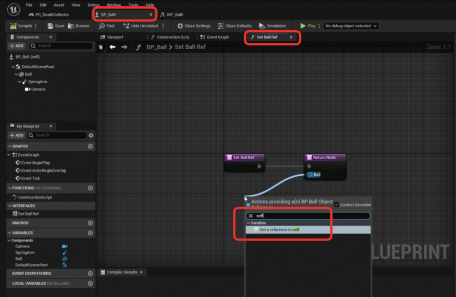 - **Return Node**의 Ball 출력 핀에 Self 노드를 연결합니다. (즉, "나 자신이 공 참조다"를 반환합니다.)