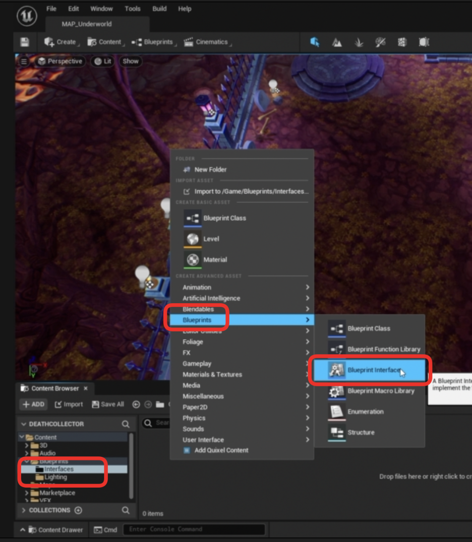 - 인터페이스 생성: Interfaces 폴더에 마우스 오른쪽 버튼을 클릭하고 블루프린트 > 블루프린트 인터페이스를 생성합니다. 이름을 **Int_Ball**로 지정합니다.