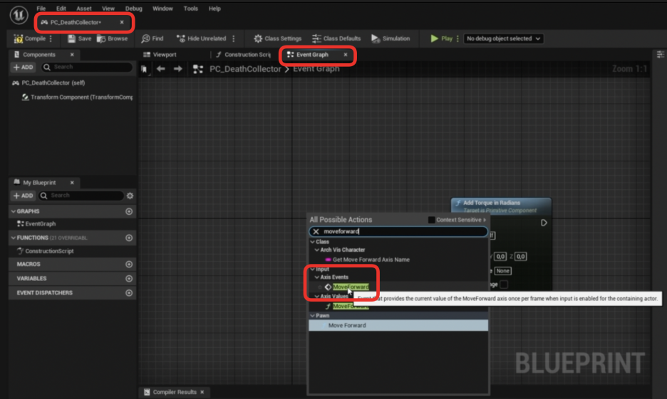 - 그래프에 마우스 오른쪽 버튼을 클릭하고 Move Forward (액시스 이벤트)를 검색하여 추가합니다.