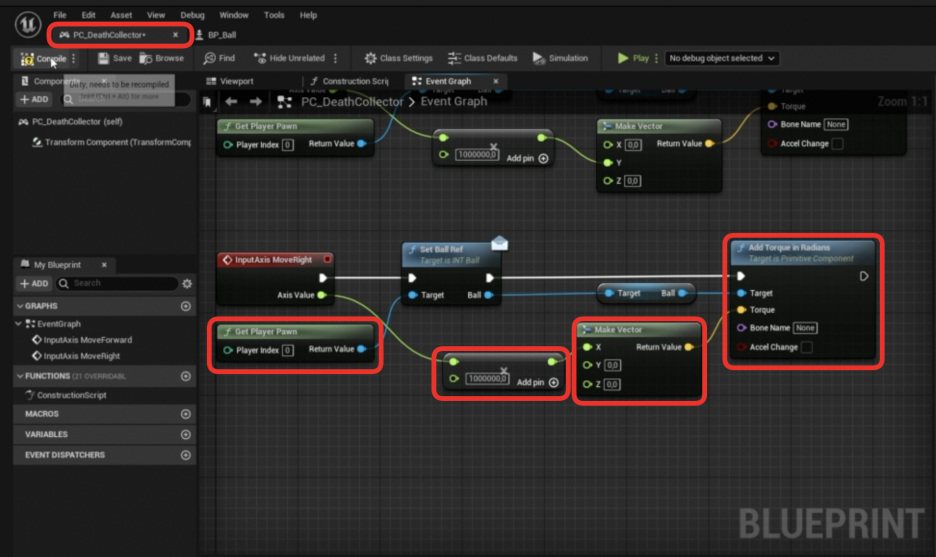 - BallMeshComponent 변수에서 Get Ball Mesh Component 노드를 가져와 **Add Torque in Radians**의 Target 핀에 연결합니다.
