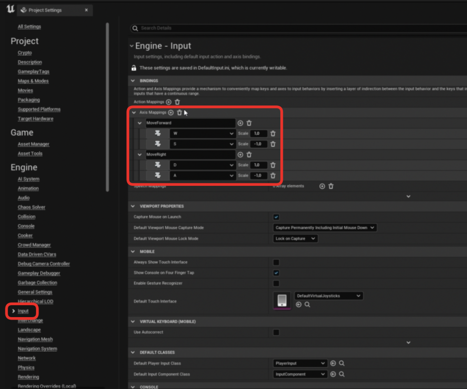 W/A/S/D 키를 사용자가 원하는 대로 변경할 수 있도록, 하드코딩 대신 액시스 매핑을 사용합니다.