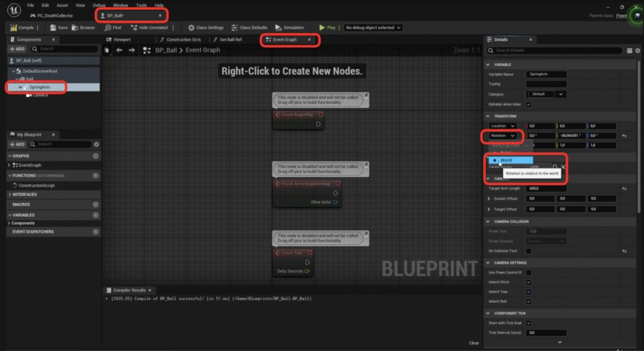 - BPBall 블루프린트에서 Spring Arm을 선택합니다.