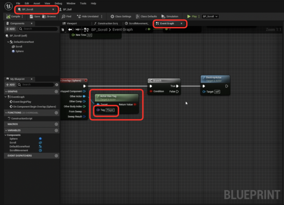 1. **BP_Scroll**의 On Component Begin Overlap 이벤트로 돌아옵니다.