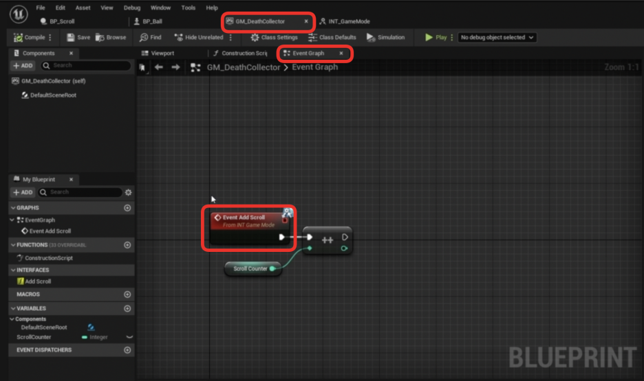 • 이 메시지가 BP_GameMode의 Event Add Scroll을 실행시켜 점수를 1 올립니다.