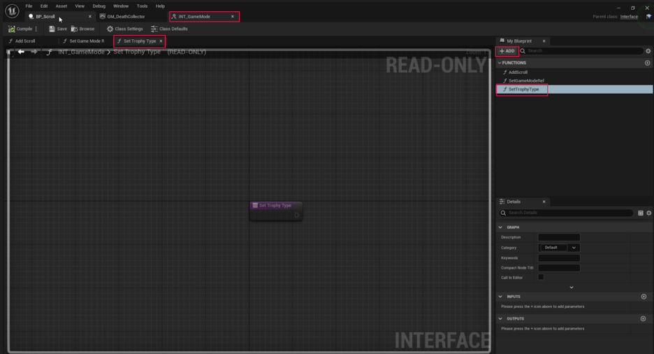 - Int_GameMode 인터페이스를 열고 새 함수 **SetTrophyType**을 추가합니다.