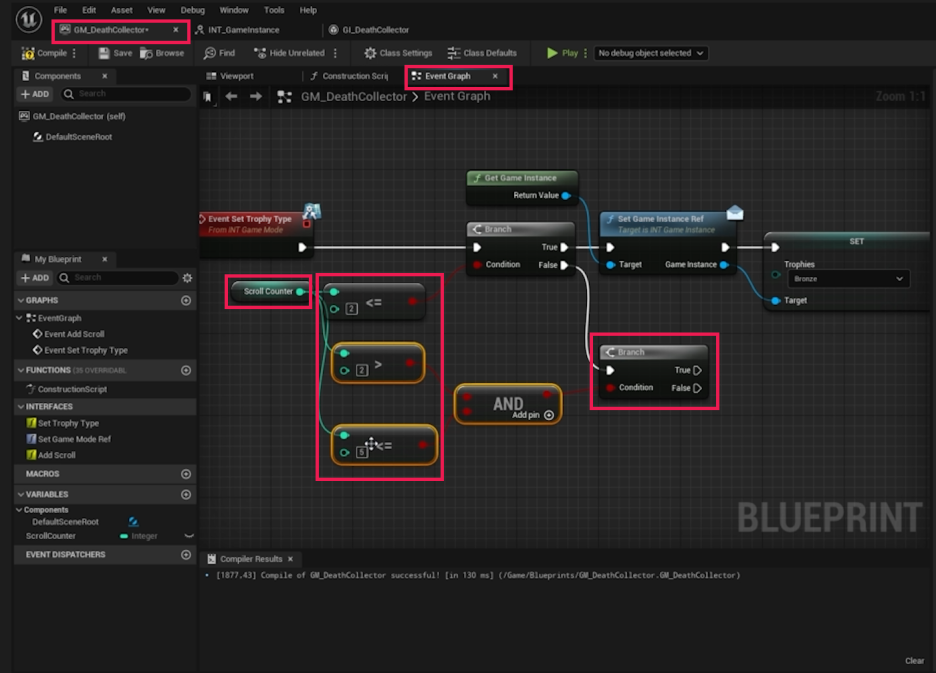 - **BP_GameMode**를 열고 Event Set Trophy Type (인터페이스 이벤트)를 구현합니다.