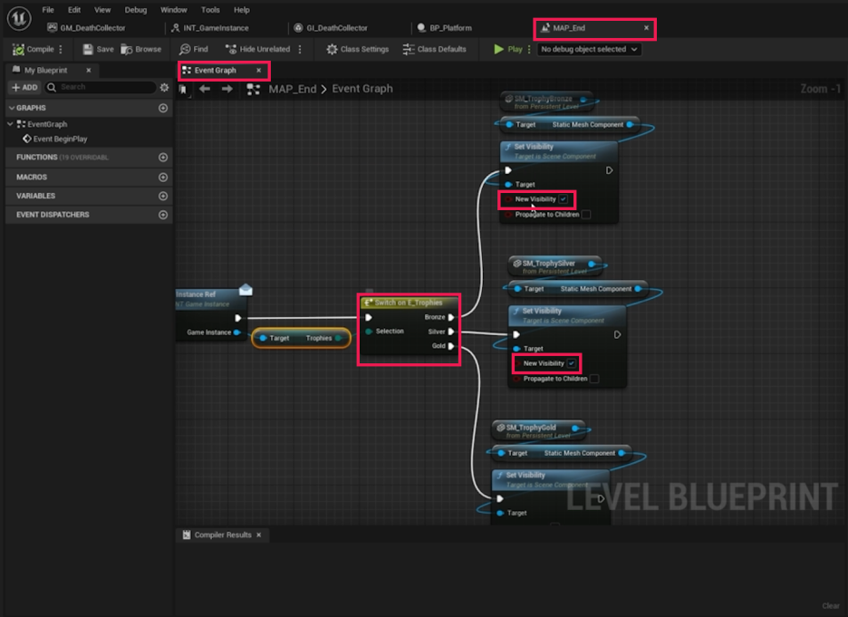 - Gold 핀: Gold 트로피의 **Set Visibility**를 True로 설정하는 노드에 연결합니다.