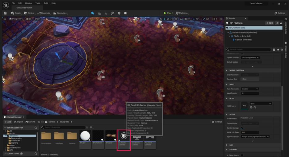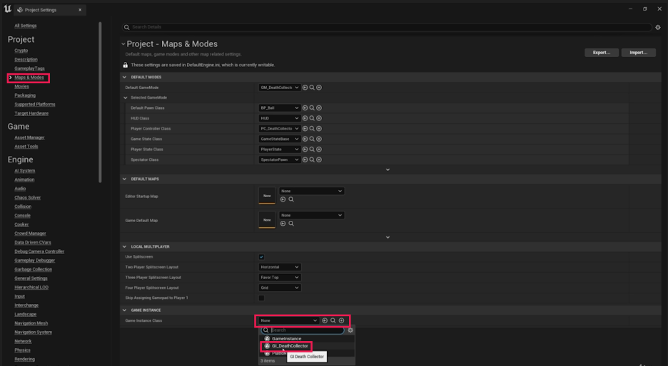 - 하단의 Game Instance Class를 **GI_DeathCollector**로 변경합니다.