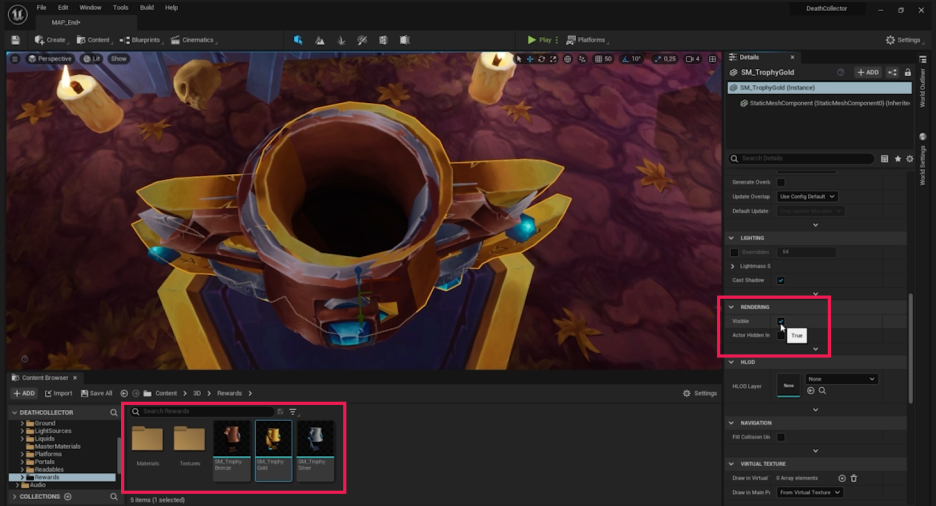 - 세 트로피 액터를 모두 선택하고, 디테일(Details) 패널에서 Rendering > Visible 옵션의 체크를 해제합니다. (시작 시 모두 보이지 않도록 설정합니다.)