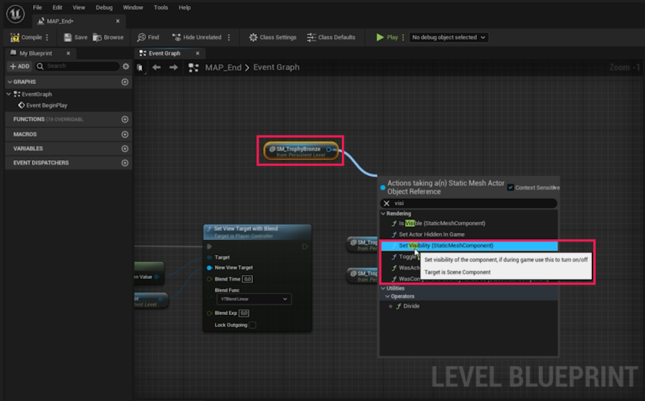 - 각 트로피 참조 변수에서 드래그하여 Set Visibility 노드를 호출합니다. (새 Visibility를 True로 설정하면 트로피가 보이게 됩니다.)
