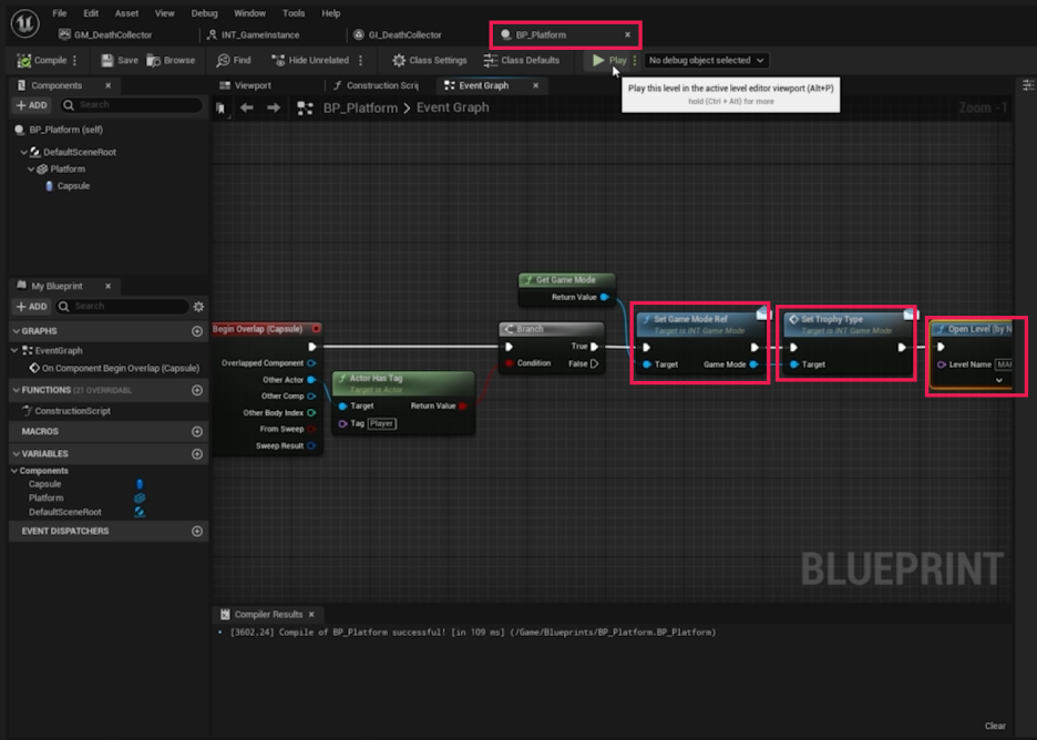 - **BP_Platform**의 On Component Begin Overlap 로직으로 돌아갑니다.