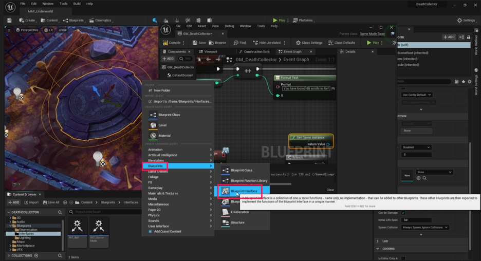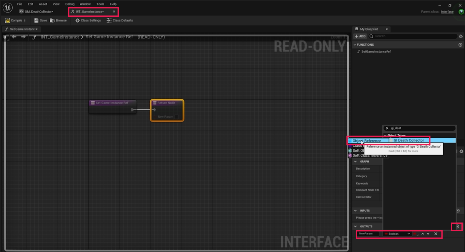 BP_GameMode가 GI_DeathCollector의 변수에 접근할 수 있도록 인터페이스를 설정합니다.