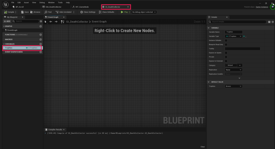 - **GI_DeathCollector**를 열고 새 변수 **Trophies**를 생성합니다.
