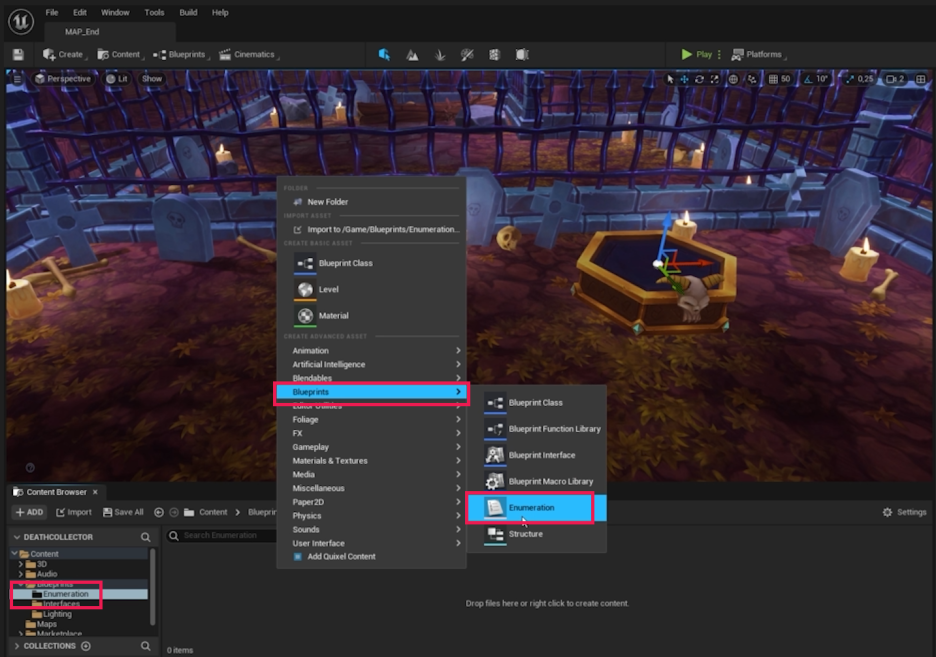 - Blueprints 폴더 내에 **Enumeration**이라는 새 폴더를 생성합니다.