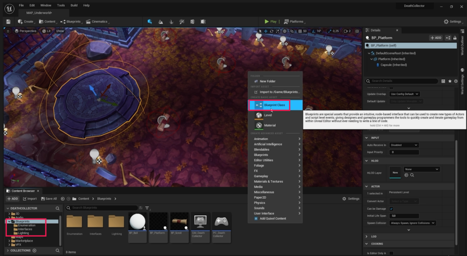 - Blueprints 폴더에서 마우스 오른쪽 버튼을 클릭하고 Blueprint Class를 생성합니다.