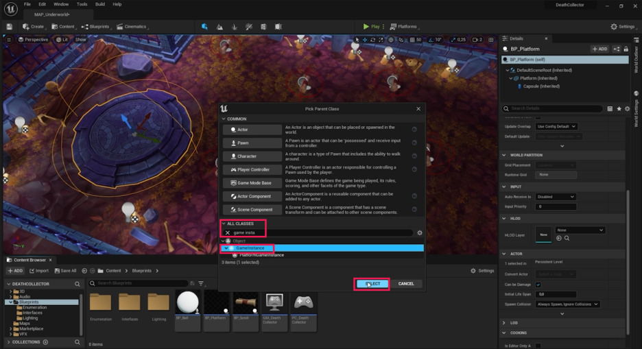 - **GI_DeathCollector**를 열고 Class Settings에서 **Int_GameInstance**를 추가합니다.