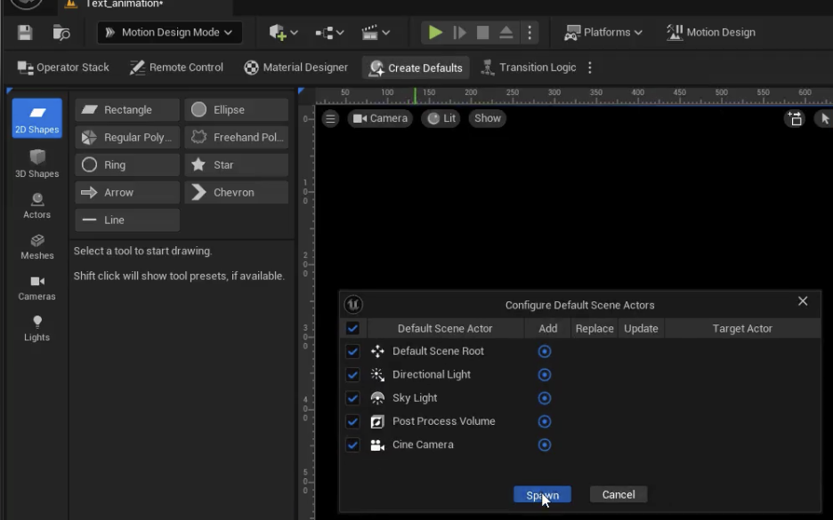 - 먼저 크리에이트 디폴트를 클릭하여 라이트와 카메라를 생성합니다.