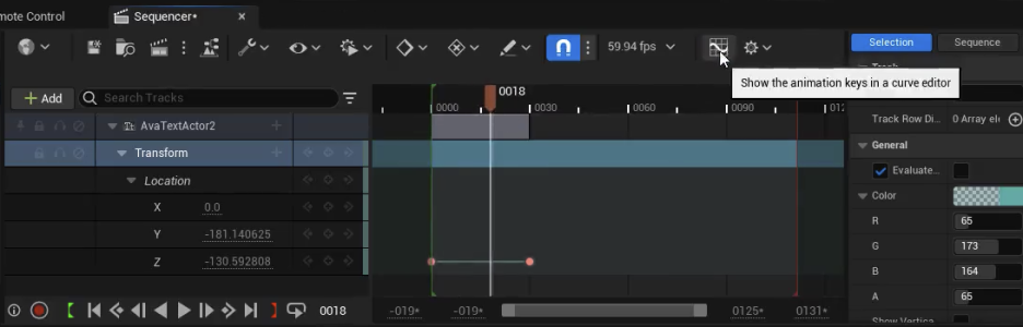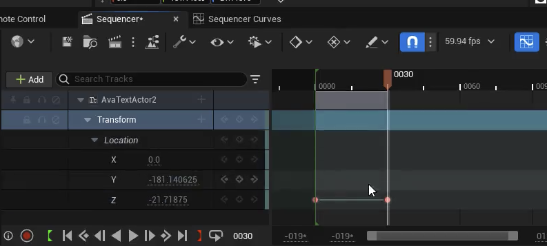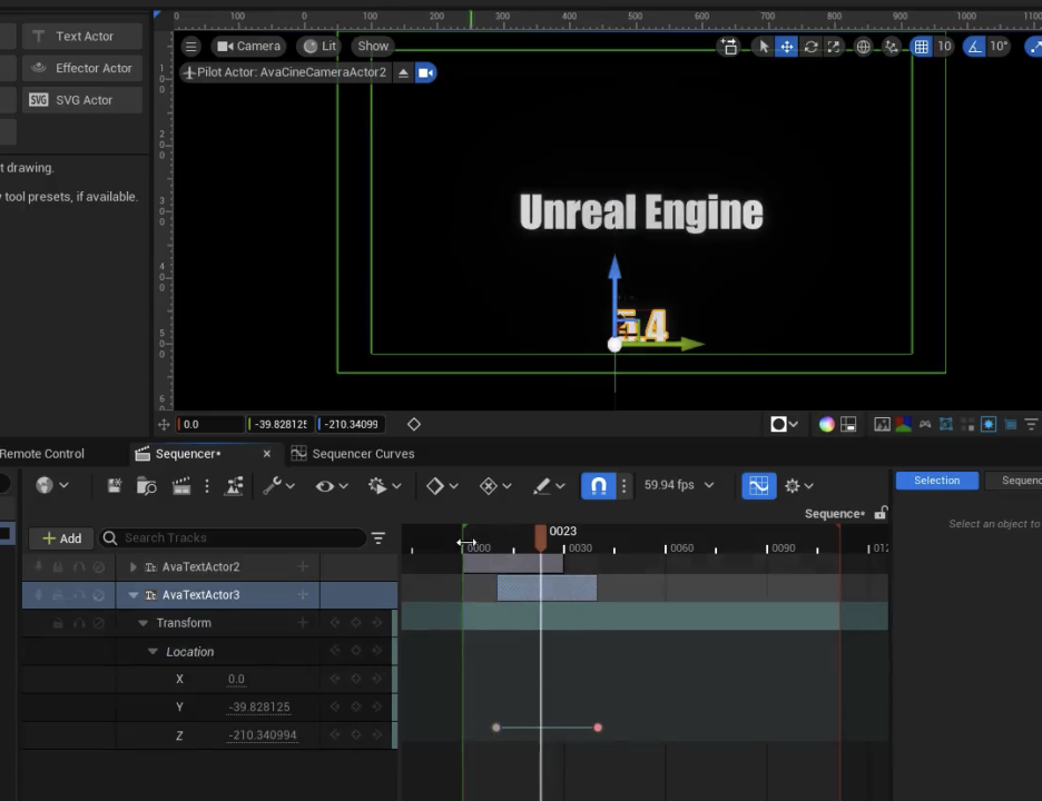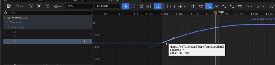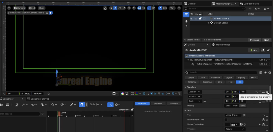 - 텍스트를 화면 밖으로 이동시키고 키를 설정합니다. 위치(Location)의 Z축에만 키를 설정하고 X와 Y축 키는 삭제합니다.