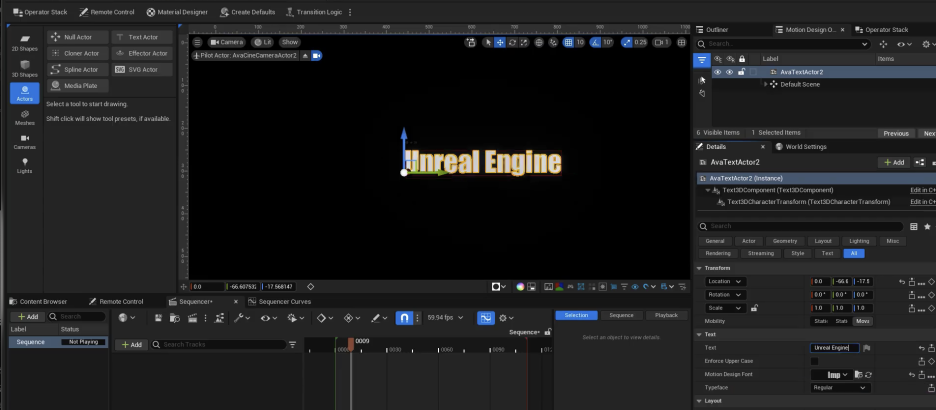 - 액터에서 텍스트 액터를 선택하고 '언리얼 엔진'을 입력한 뒤 글꼴을 변경합니다.