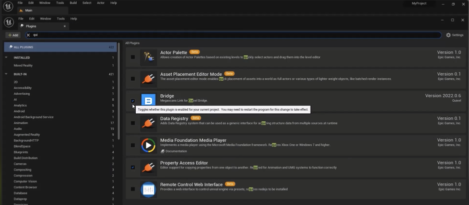 만약 어떤 이유로든 이 탭이 없다면 'Edit' > **'Plugins'**로 이동하여 검색창에 **'Quixel'**을 검색하고 Quixel Bridge를 찾아 체크한 다음 언리얼 엔진을 재시작하면 다음 실행 시 Quixel Bridge를 사용할 수 있습니다.