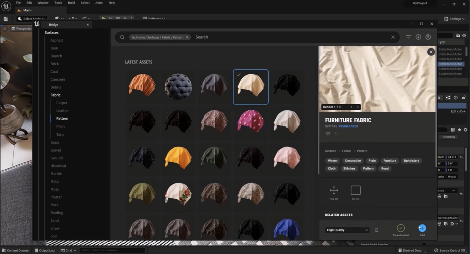 이제 Quixel로 돌아가서 몇 가지를 더 찾고 작업을 시작해봅시다. 표면에 다른 재질을 추가하는 방법을 배워봅시다. 예를 들어, 이 가구 조각에 말이죠. Quixel로 가서 **'Surfaces'**로 이동해야 합니다. 왜냐하면 저는 **직물(fabric)**을 추가하고 싶기 때문입니다.