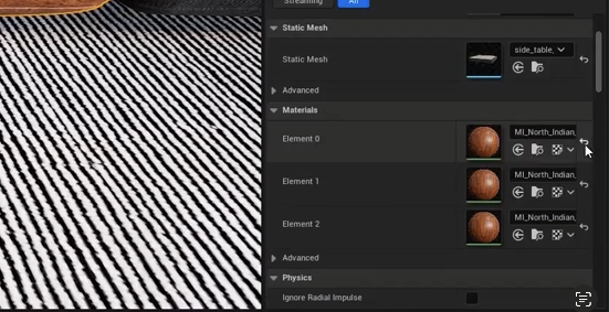 'Revert' 버튼을 클릭하면 이전 나무 재질로 되돌아갑니다. 다시 테이블 자체 또는 오른쪽에 있는 이 아이콘으로 드래그하여 적용할 수 있습니다. 보시다시피 텍스처를 이 모든 객체에 적용했습니다. Quixel 재질은 정말 작업하기 즐겁습니다.