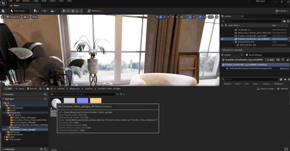 이 Quixel 라이브러리에서 객체를 실제로 사용하는 것은 매우 쉽습니다. 이 객체들을 사용하는 것은 전혀 복잡하지 않습니다. 이 설정에서 사용할 수 있는 몇 가지 객체를 찾아보겠습니다. 예를 들어, **'Interior'**로 가서 장식용 재료, 꽃병 등을 찾아 어떻게 작동하는지 보여드리겠습니다.